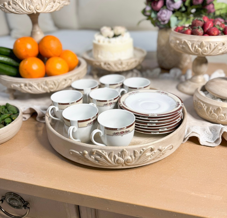 اجزا سرویس تشکیل شده از استند دوطبقه ،شیرینخوری ،میوه خوری، شکلاتخوری، سینی و کاسه تنقلات