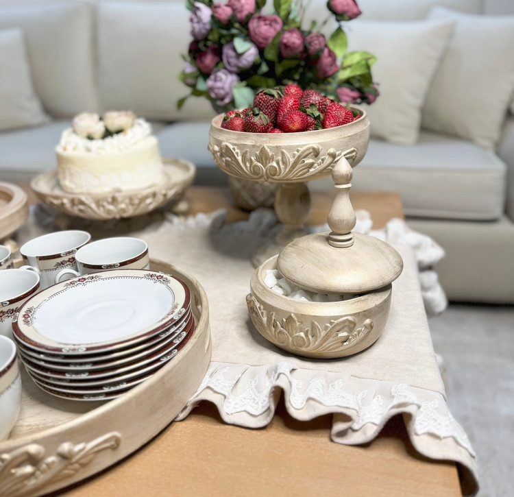 اجزا سرویس تشکیل شده از استند دوطبقه ،شیرینخوری ،میوه خوری، شکلاتخوری، سینی و کاسه تنقلات