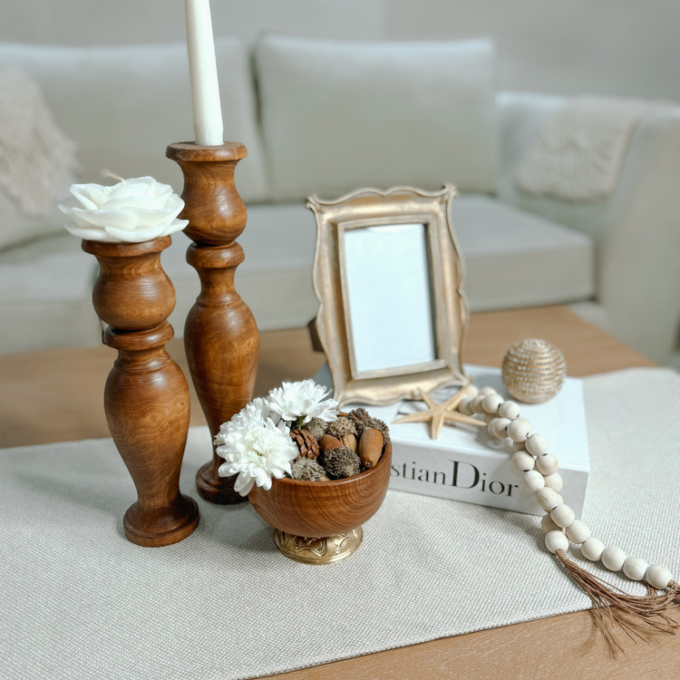 ست دکوری گندم تشکیل شده از ست دوتایی جاشمعی مدل کهربا ساخته شده از چوب چنار به ارتفاع ۲۵/۳۰ سانتیمتر و یک کتاب دکوراتیو که داخل آن جا برای گذاشتن اکسسوری می باشد و یک قاب عکس با پتینه طلایی و کهنه کاری شده یک عدد پیاله مناسب تنقلات به قطر تقریبی ۱۲ سانتیمتر که پایه برنزی دارد و زیبایی کار را چندین برابر میکنه یک ریسه و شمع قلمی و شمع گل رز می باشد اگر علاقه مند هستید که رو میزتون یه دکوری خاص که تنقلات هم بخواید سرو کنید یکی از بهترین گزینه هاست