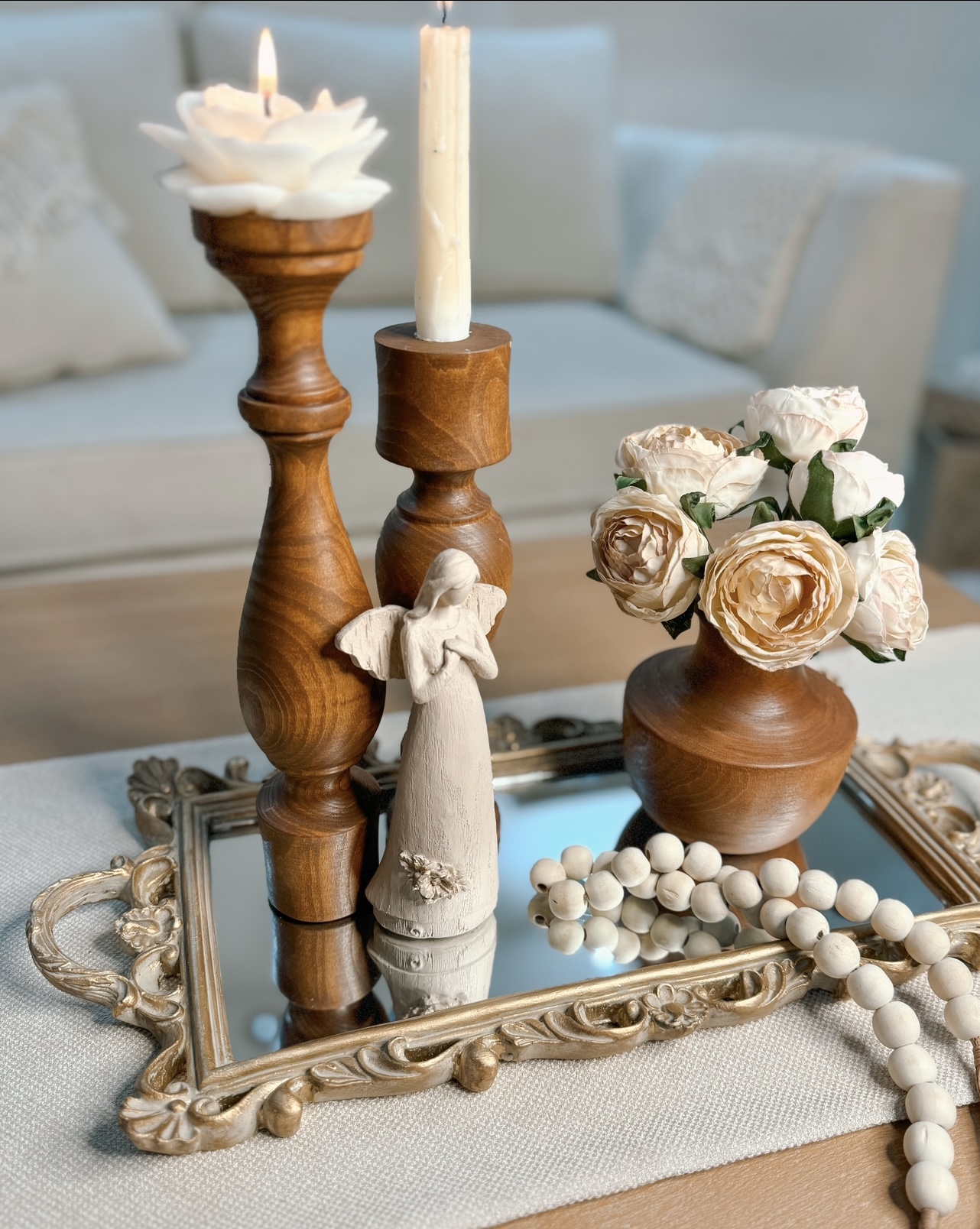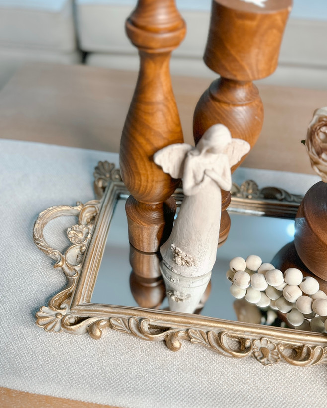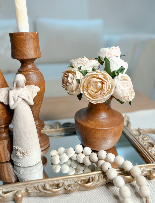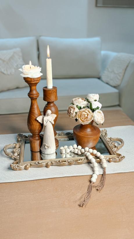 اجزا ست دکوری چوبی آلاله تشکیل شده از دو عدد جاشمعی با چوب چناربه ارتفاع های ۳۰و ۲۵ سانتیمتر که مناسب شمع قلمی و استوانه ای می باشد و یک گلدان چوبی مینیمال به ارتفاع تقریبی ۱۲ سانتیمتر می باشد و سینی مستطیل پلیستر به رنگ طلایی و پتینه کهنه کاری شده و یک عدد تندیس فرشته ودو مدل شمع گا رز و شمع قلمی و یک عدد ریسه چوبی می باشد که یکی از زیباترین هاست و میتونه بهترین گزینه برای هدیه دادن باشد در دو رنگ عسلی و قهوه ای فقط رنگ چوب ها قابل تغییر هست